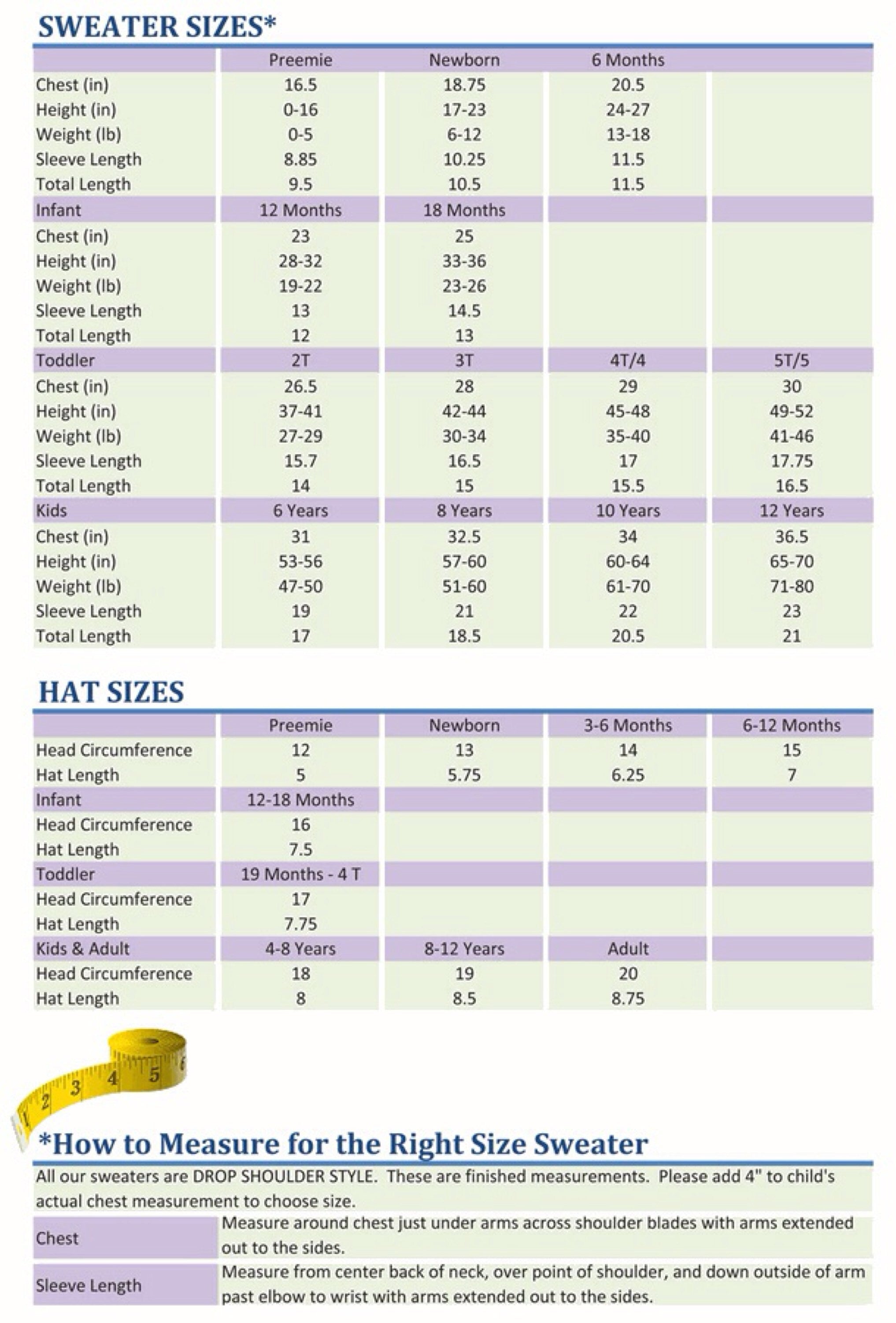 Available Sizes: Preemie, Newborn, 3-6 mos, 6-12 mos, 12-18 mos, Ages 2 to 4, Ages 5 to 8, Ages 9 to 12 Adult size is $5.00 more. See our Adult Knits section.